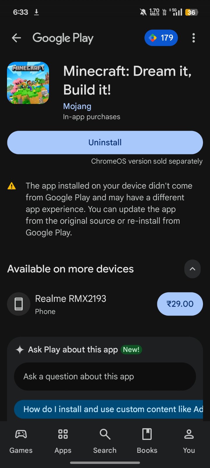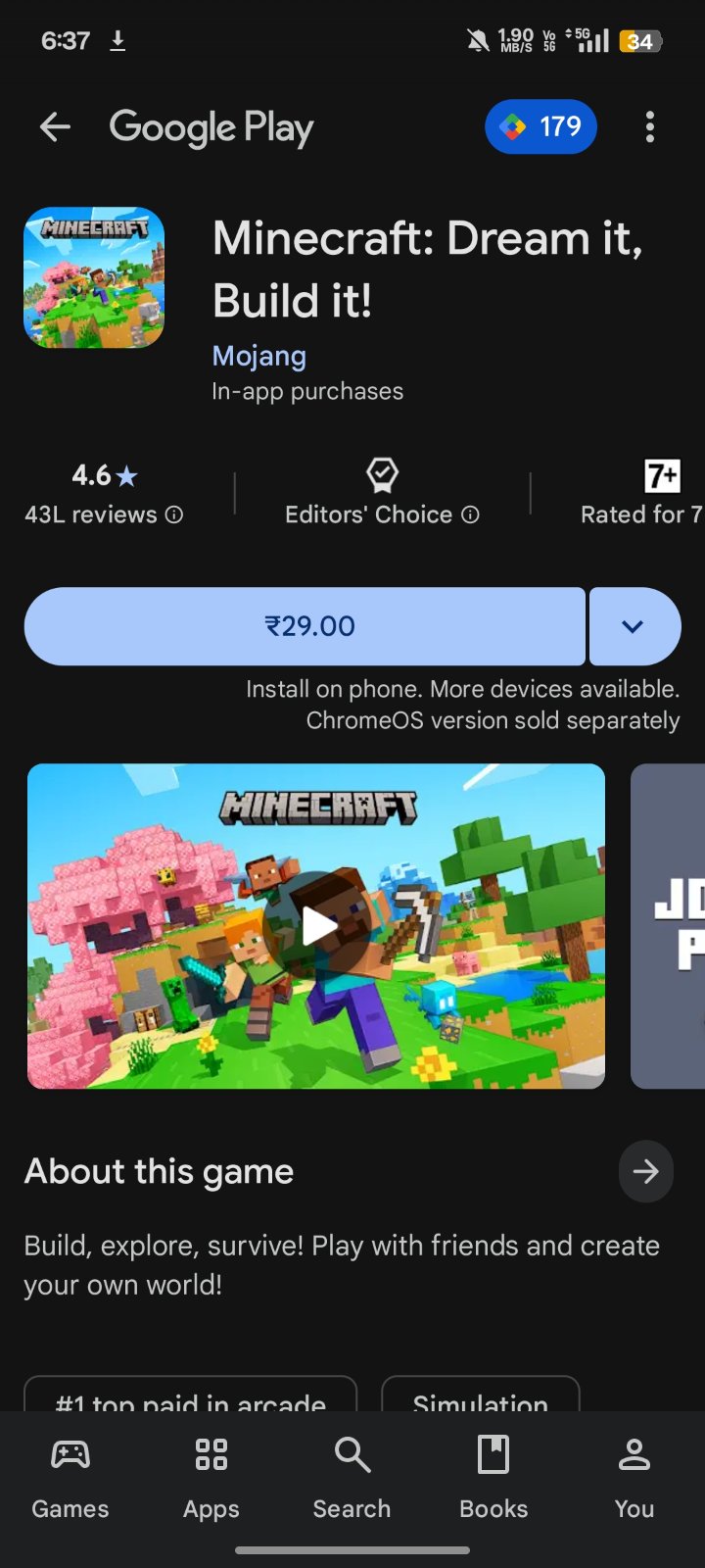 Immerse yourself in an open 3D sandbox world of building, crafting, and survival. Gather resources, survive the night, and create epic adventures block by block in a fully open world where you can play solo or with friends. Build houses, cities, or farms, explore diverse biomes, fight enemies, or freely experiment in Creative mode with unlimited resources, or test your skills in Survival mode with combat and danger.