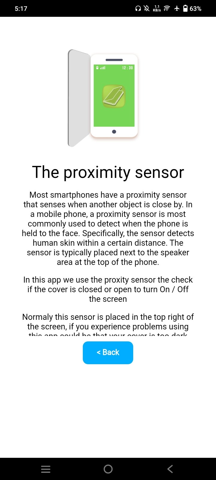 Overview: Uses the proximity sensor to turn screen off and on when you use a flip book cover ideal to reduce the use of your fingers just to check the screen and reduce virus and bacterias.