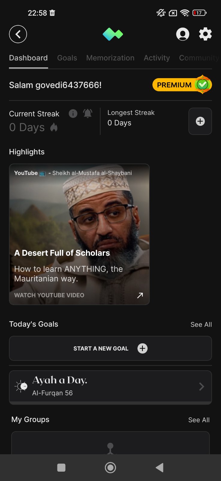 Set custom Goals for what you want to memorize and revise. Choose your portion, deadline and the type of engagement you want; memorization, reading, revision or recitation!
